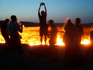 After two nights in a fancy hotel with a great pool, heaps to see and explore and a chance to get all the laundry done, we headed almost directly north for one of Turkmenistan’s really special sights, the burning gas crater of Davassa. Arriving early evening we set up camp in the desert, while Ata the local guide, hiked off to find a monster desert truck to bounce us over the sand dunes to the gas crater. It’s an amazing drive to an even better spectical. Arriving just before dark there is a slight glow from the massive crater and it gets more spectacular as the skies get darker.